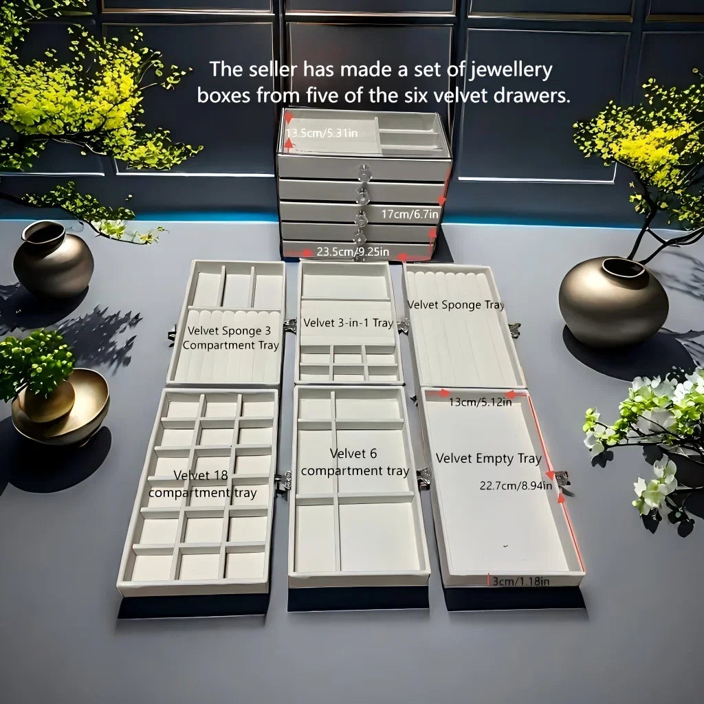 Mantenha suas joias organizadas, protegidas e sempre à mão com o Organizador de Jóias em Veludo 5 Camadas. Com design sofisticado e acabamento em veludo macio, essa caixa é ideal para guardar brincos, pulseiras, colares e anéis com segurança e estilo. Suas cinco camadas oferecem amplo espaço e compartimentos inteligentes para facilitar a organização e exibição das suas peças favoritas.