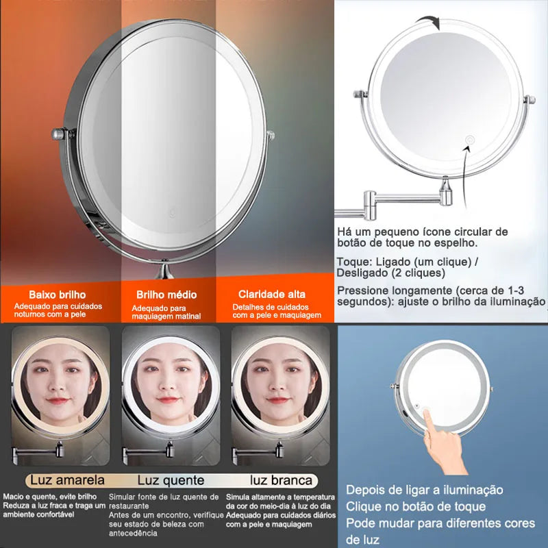 ESPELHO DE MAQUIAGEM DE PAREDE LED DOBRÁVEL – LUZ TRICOLOR E AMPLIAÇÃO