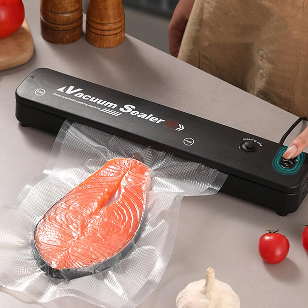 Mantenha seus alimentos frescos por até 5 vezes mais tempo com a Máquina de Embalagem a Vácuo Automática! Ideal para uso doméstico, ela remove o ar da embalagem e sela hermeticamente, conservando sabor, textura e nutrientes. Uma verdadeira aliada na cozinha para organizar, economizar e evitar desperdícios!