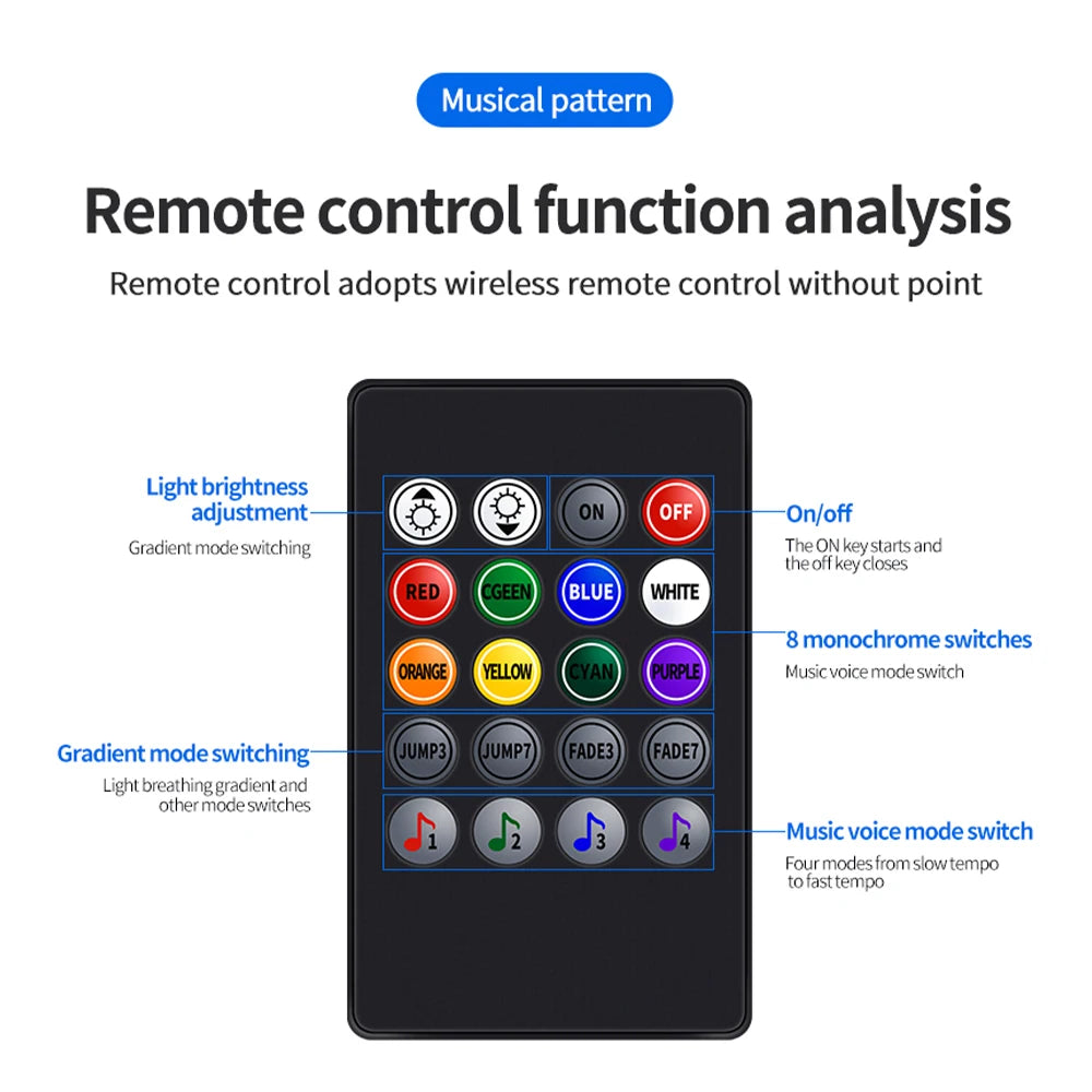 7) Control mode: 4 Music control mode, 8 signal color control, brightness control, ON/OFF, 2-segment jump mode control, fade-in and fade-out mode control.